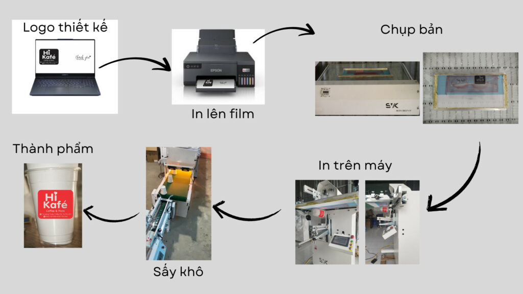 - In lên film: Sau khi đã có bản thiết kế, logo được in ra film (phổ biến là film đục). Chú ý: film sẽ có 2 mặt: 1 mặt trơn và 1 mặt nhám, cần đặt đúng mặt nhám để mực được bám đều lên bề mặt giấy.