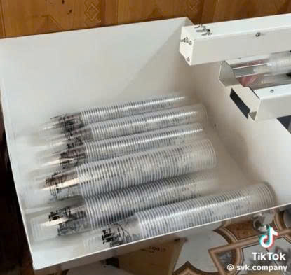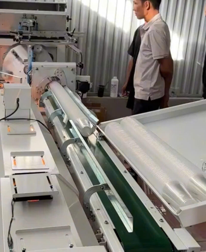 Tiếp theo, ly sẽ chạy thẳng vào bộ phận đếm và xếp ly. Đây là bộ phận giúp tiết kiệm sức người nhiều nhất sau in. Máy sẽ đếm chính xác số lượng ly theo cài đặt ban đầu, khi đủ số sẽ tự động gạt thành từng chồng gọn gàng. Người vận hành chỉ cần lấy chồng ly đã in và cho vào túi hoặc thùng đã chuẩn bị sẵn.