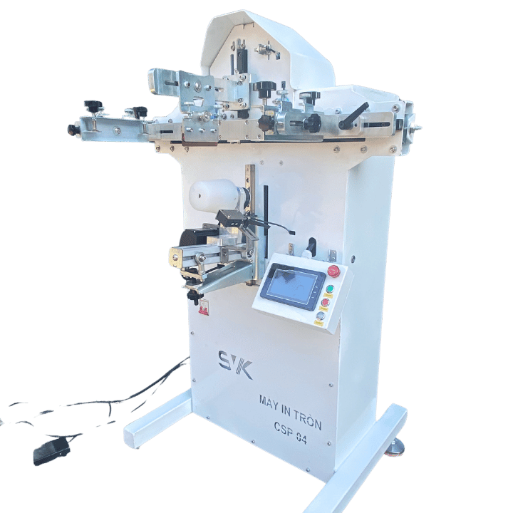 - CSP-C04 máy in trụ tròn chồng màu bán tự động, là dạng máy sử dụng cho sản xuất với quy mô vừa và nhỏ, sản phẩm ứng dụng công nghệ in lụa, sử dụng để in các vật có biên dạng trụ tròn bằng phương pháp bán tự động.